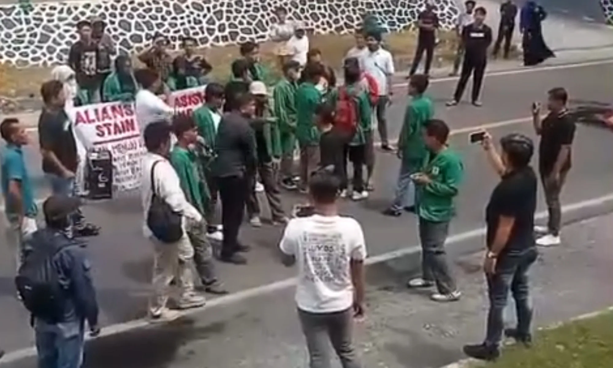Asap hitam dari pembakaran ban terlihat membumbung ke udara dan cukup pekat. Kondisi tersebut berpotensi mengganggu jarak pandang pengguna jalan. Beberapa warga yang berada di sekitar lokasi tampak menyaksikan aksi dari pinggir jalan. Situasi dalam video menunjukkan suasana aksi berlangsung dalam pengawasan aparat kepolisian yang berada di sekitar titik kegiatan.