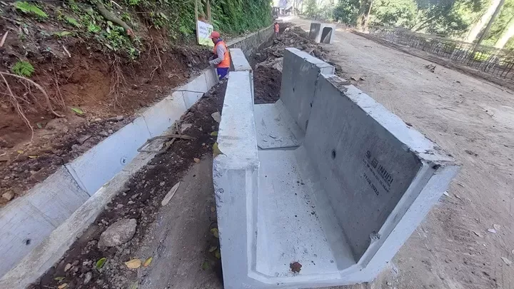 Selain itu, bronjong atau kawat baja berisi batu juga dipasang di sisi jalan untuk menahan tebing. Metode ini dipilih karena efektif mencegah longsor susulan di jalur dengan kontur tanah labil. Tahap berikutnya adalah pemasangan capping beam, struktur beton yang mengikat pondasi agar lebih kokoh.