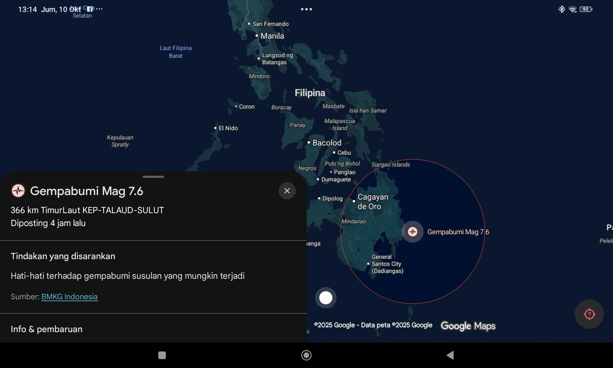 Filipina, Harianmedia — ada 10 Oktober 2025 pagi, gempa kuat berkekuatan 7,4 skala Richter mengguncang lepas pantai Davao Oriental (Filipina). Peringatan tsunami sempat dikeluarkan untuk beberapa wilayah, termasuk peringatan yang menjangkau sebagian pesisir Indonesia. Setelah beberapa jam pengamatan, ancaman besar tsunami dinyatakan lewat, namun gelombang kecil tercatat di beberapa posisi pesisir di Indonesia. Pemerintah Filipina melaporkan korban jiwa dan kerusakan pada bangunan; pihak berwenang Indonesia — termasuk BMKG — memantau situasi dan mencatat kenaikan muka air laut yang sangat kecil di sejumlah stasiun pengamat.