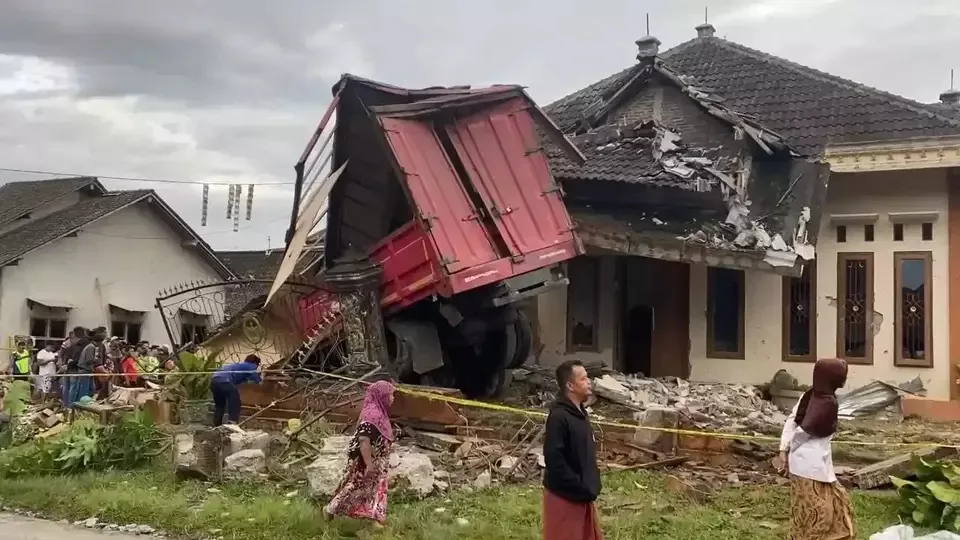Tiga rumah yang berada tepat di pinggir jalan dilaporkan mengalami kerusakan akibat tertabrak kendaraan tersebut. Bagian depan bangunan rusak dan material bangunan berserakan di sekitar lokasi kejadian. Struktur dinding dan bagian atap terlihat terdampak cukup serius akibat benturan.
