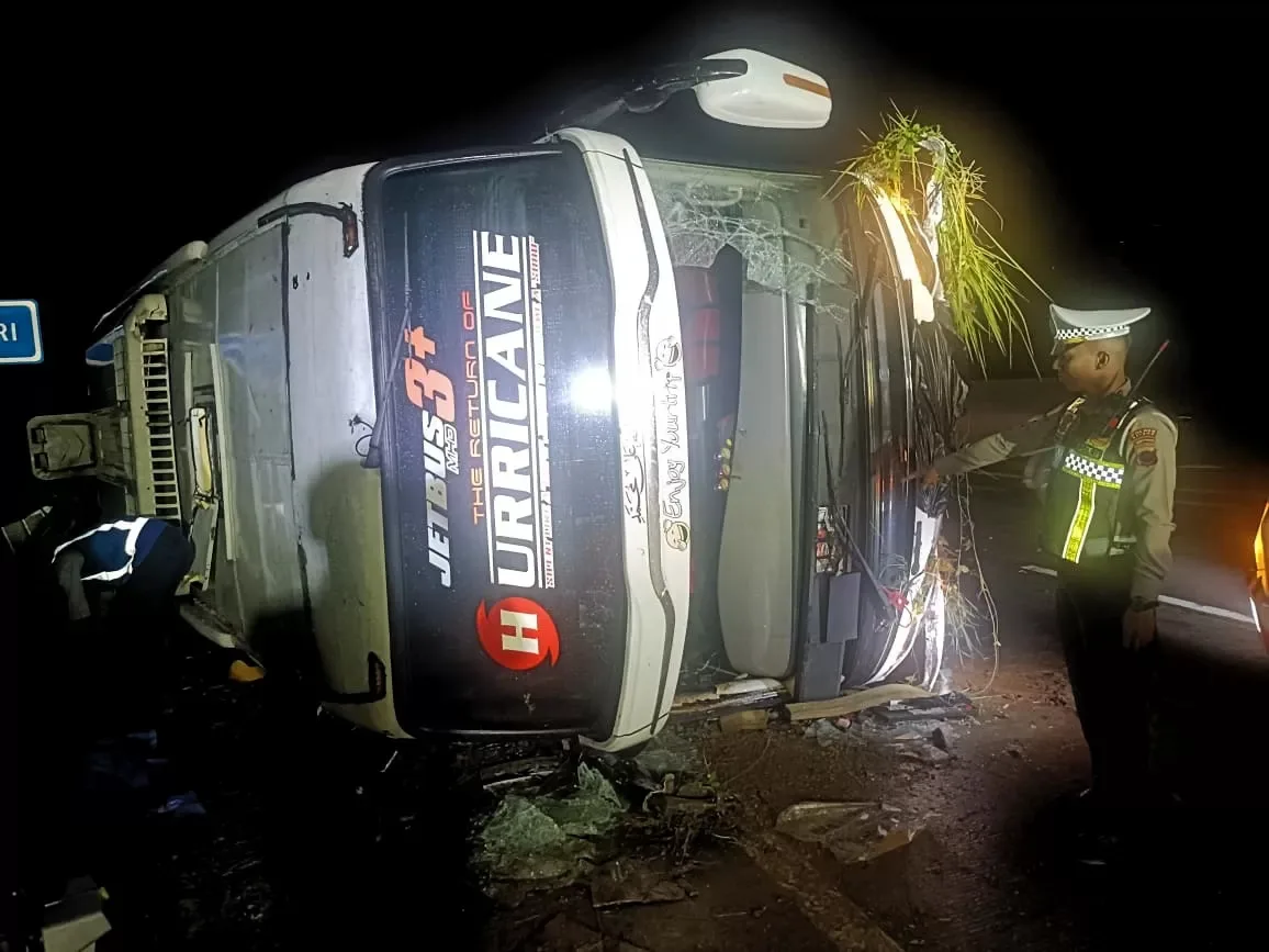 Hujan Deras, Jalan Licin: Bus PO Haryanto Terguling di Tol Batang